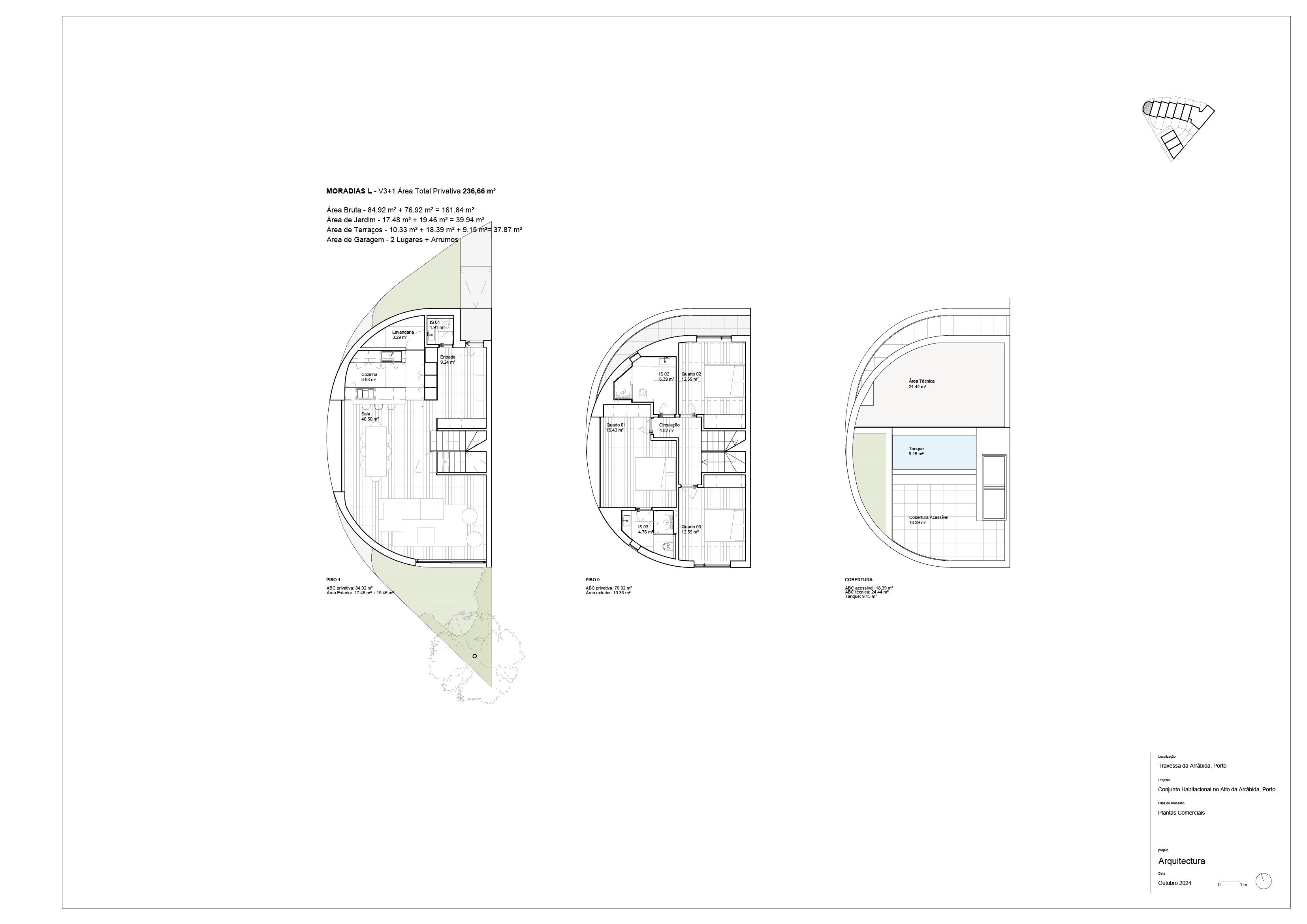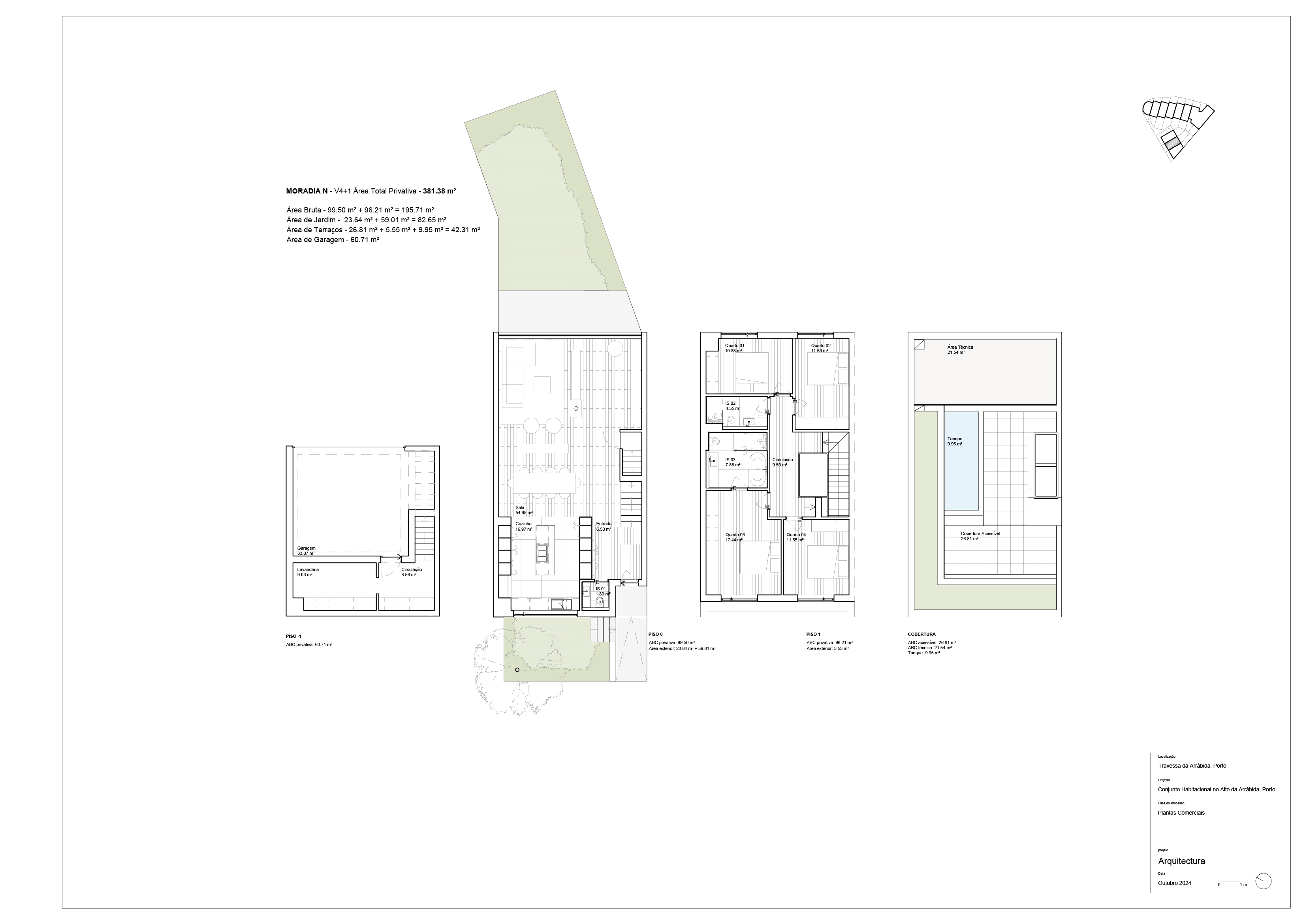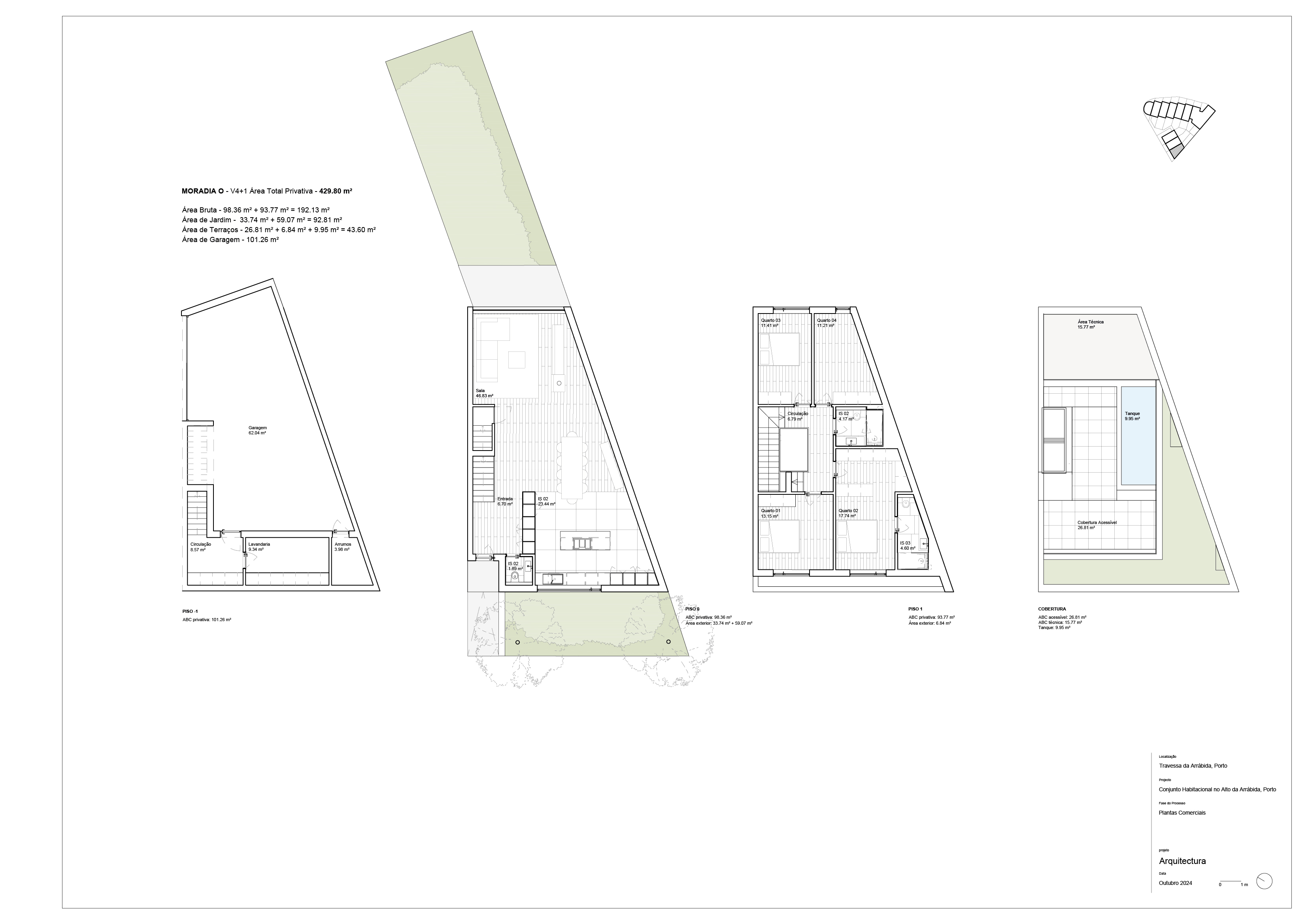 O projeto conta com 15 unidades — 6 apartamentos de tipologias T1 a T3 e 9 moradias V3 e V4 — numa área total de 4.000 m², com jardins privativos, terraços generosos e acabamentos de excelência.