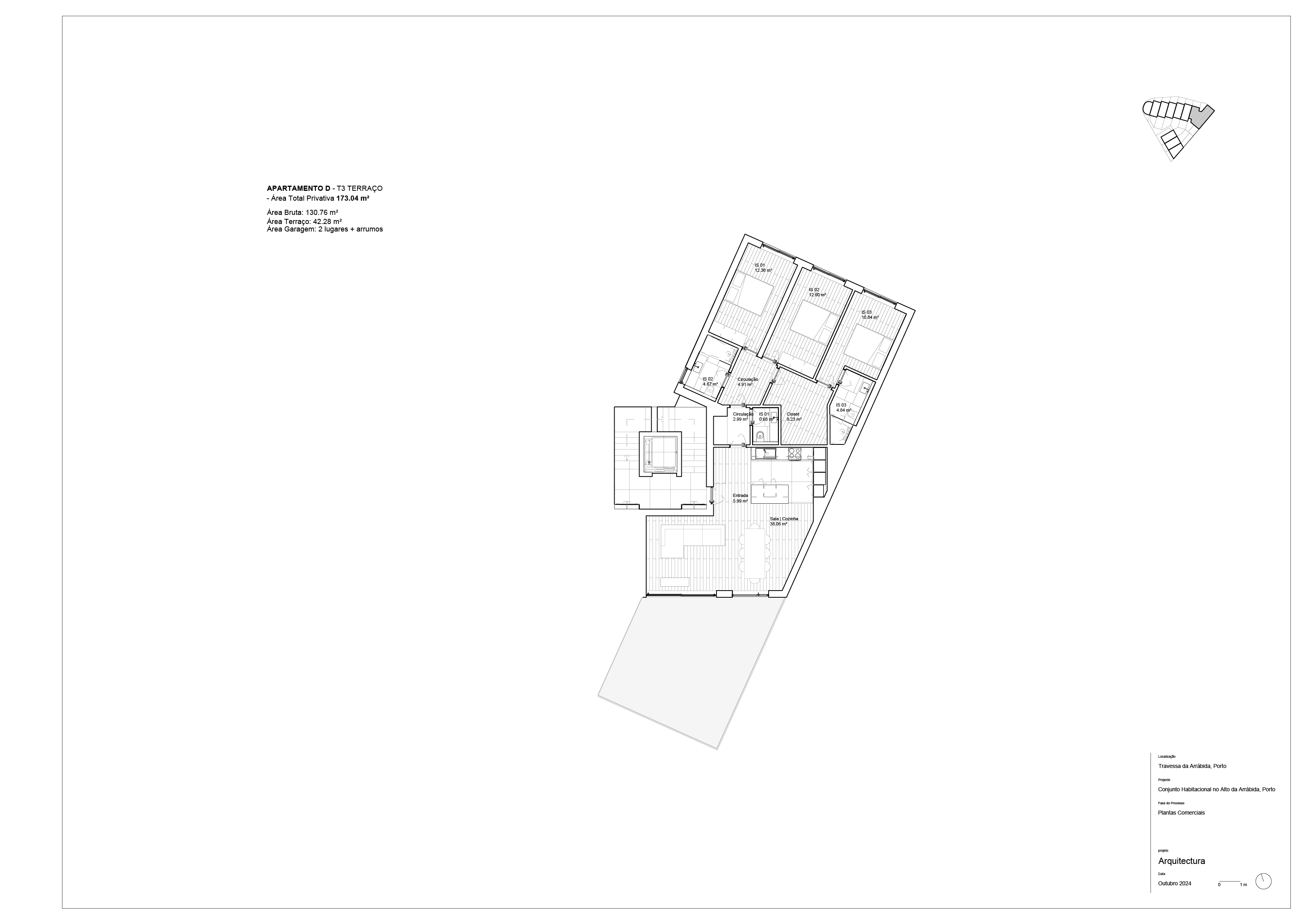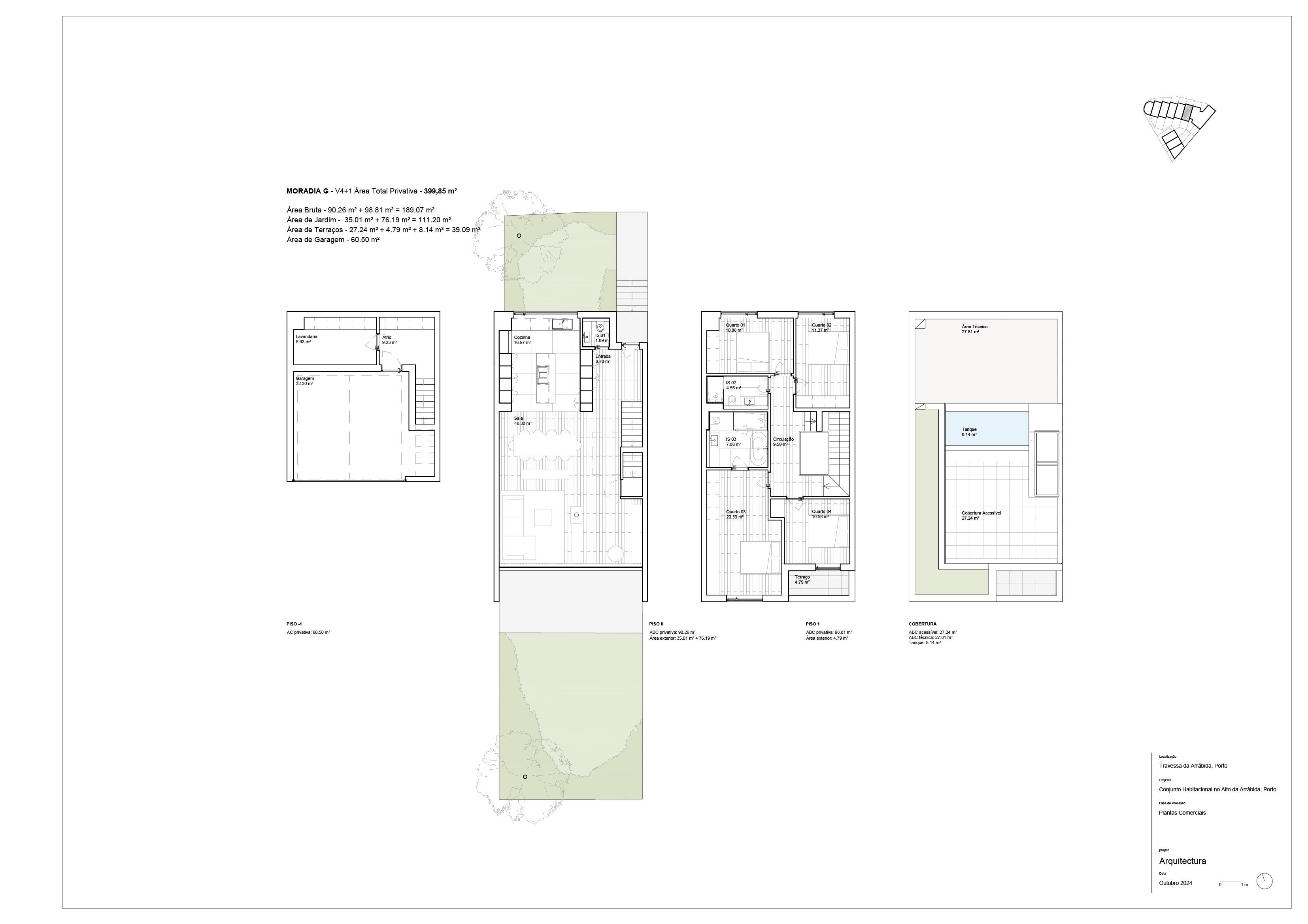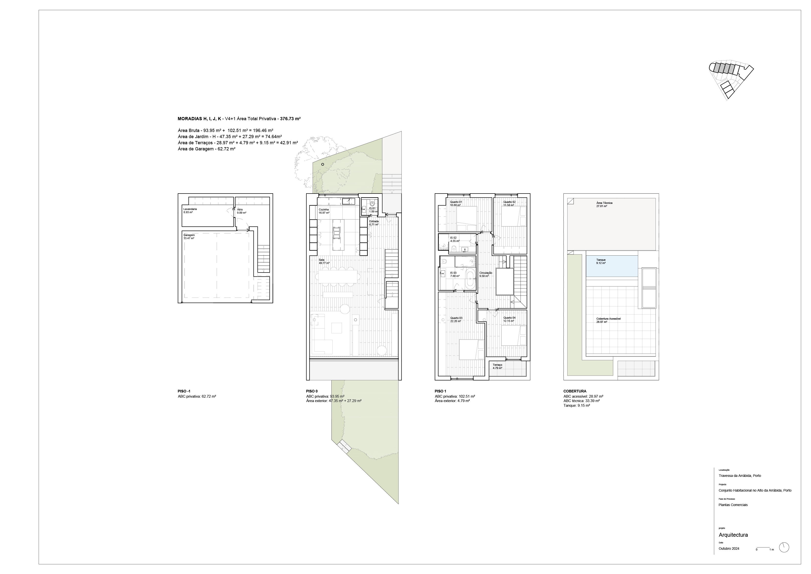 O projeto conta com 15 unidades — 6 apartamentos de tipologias T1 a T3 e 9 moradias V3 e V4 — numa área total de 4.000 m², com jardins privativos, terraços generosos e acabamentos de excelência.